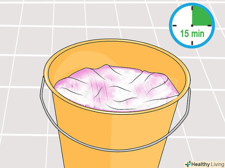 Вимочуйте плаття протягом 15 хвилин. опустіть забруднене плаття в приготований розчин, так щоб воно повністю занурилося в рідину. Протримаєте його в розчині 15 хвилин, щоб вивести пляму. [11]