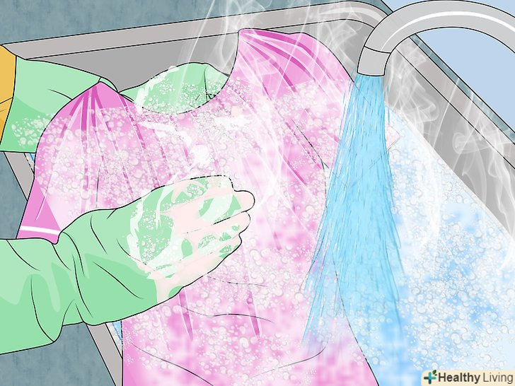 Сполосніть плаття в гарячій воді. після того як ви вимочите плаття протягом 15 хвилин, дістаньте його з розчину і споліскуйте під гарячою водою до тих пір, поки не змиєте залишки розчину і з нього перестане стікати мильна вода. Після цього виперіть плаття як зазвичай. [12]