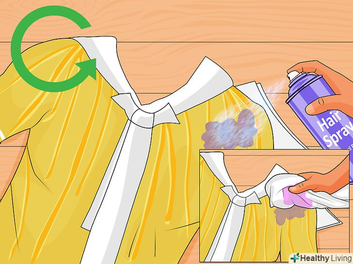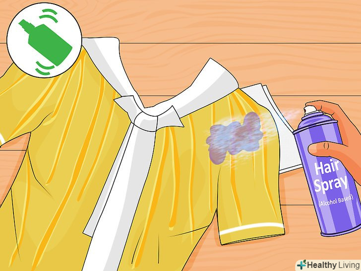 Рясно розпорошите на пляму лак для волосся. після того як ви покладете забруднене місце на паперовий рушник, струсіть балончик з лаком для волосся і направте його на чорнильну пляму. Нанесіть лак для волосся, щоб він повністю просочив тканину. [2]- Використовуйте лак для волосся на основі спирту.