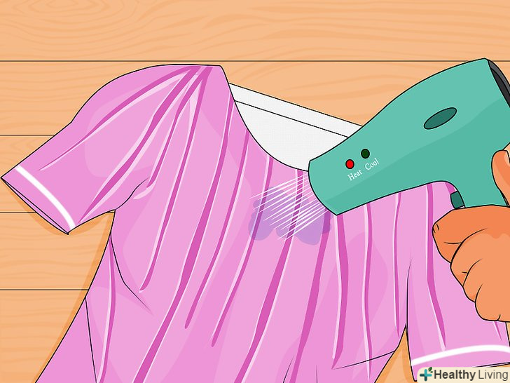 Осушіть очищене місце феном. після спирту можуть залишитися кругові розлучення. Щоб прибрати їх, направте сопло фена прямо на очищене місце. [8]- Дуйте з фена на очищену ділянку до тих пір, поки тканина не висохне. Зробіть це відразу після того, як видаліть пляму, щоб спирт не встиг висохнути сам.