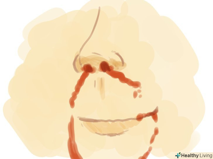 Інтенсивна кровотеча. враховуючи те, що Справжня кров часто розмазується, вам слід зробити кілька мазків по краю рота і шиї.- Визначте з якої ніздрі йде більше "крові". Нанесіть більше рідини на ту сторону рота і носа, на якій "відзначено більш інтенсивне кровотеча". Іншу сторону рота залиште чистою.