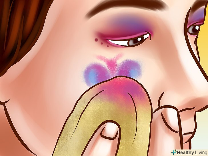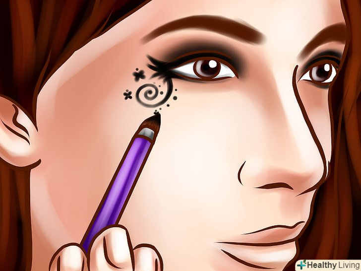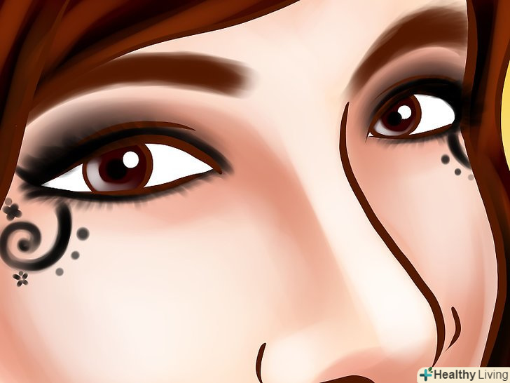 Якщо хочете бути дійсно сміливою, спробуйте нанести на обличчя візерунки, які виглядають так, ніби виходять з ваших очей – вони не йдуть нижче вилиць або занадто високо на лобі (так ви можете злегка переборщити). Можете нанести ці малюнки, використовуючи тонку м'яку кисть і нормальну фарбу для обличчя (її різновид ви можете побачити на ярмарках; купіть фарбу для макіяжу в магазині, звичайному супермаркеті або навіть в Інтернеті). На цьому етапі ви можете створити тему вашого готичного вигляду. Наприклад, можете намалювати чорну сітку навколо кожного ока або випадкові завитки, які виступають із зовнішніх куточків очей, з квітами на кінцях. Будьте креативні і використовуйте свою уяву!- Якщо хочете створити щось на зразок метелика, потрібно губкою, а не пензлем нанести основну її частину. Це додасть малюнку навіть ще більшу протяжність, ніж нашарування ліній, що створюють певну форму.