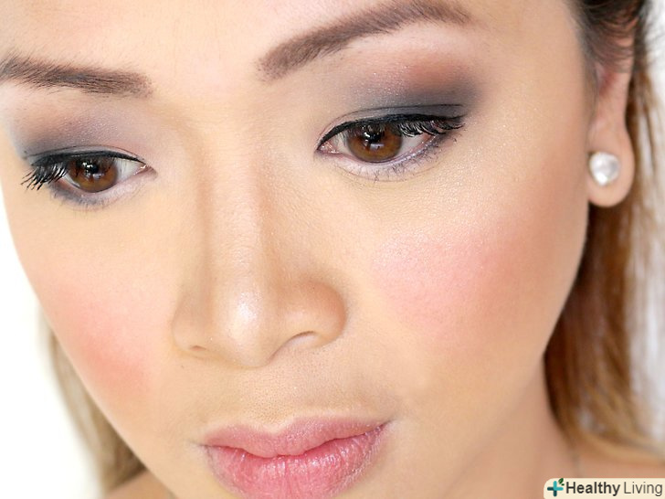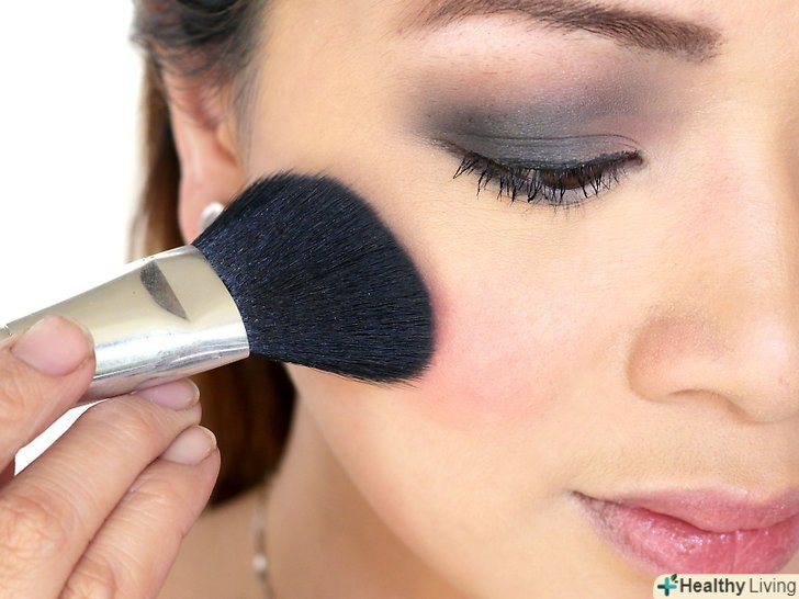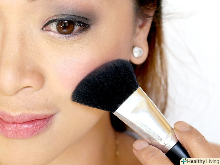 Завершіть шаром напівпрозорої пудри. щоб закінчити ваш зовнішній вигляд, візьміть напівпрозору пудру з легким блиском.- Використовуйте маленьку кисть, щоб нанести трохи пудри під зовнішніми куточками очей, а потім використовуйте вихрові рухи, щоб розтушувати її у верхньому краю рум'янцю.