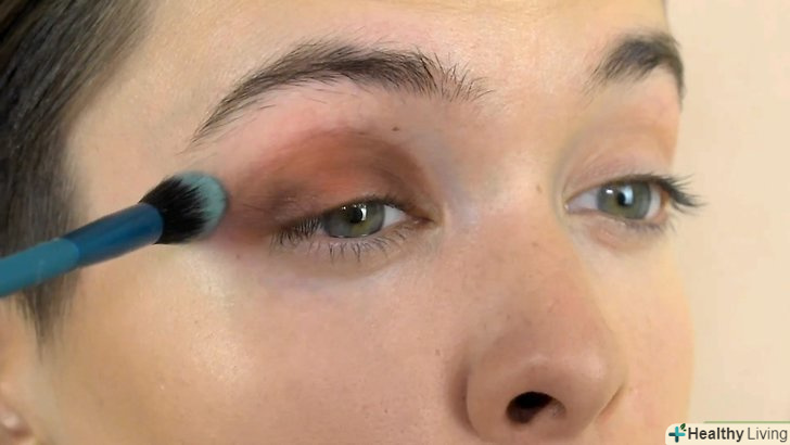 - За допомогою плоскої пензлика накладіть середній відтінок палітри по всій повіці. ви також можете нанести базові тіні на внутрішній куточок ока і під брови, щоб погляд був відкритим. [6]