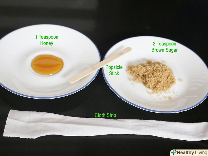 Приготуйте необхідні матеріали. Вам буде потрібно взяти дві ложки коричневого цукру, одну ложку меду, одну ложку води, ніж для масла або паличку від морозива і тканинні смужки, щоб зняти з шкіри склад для депіляції.