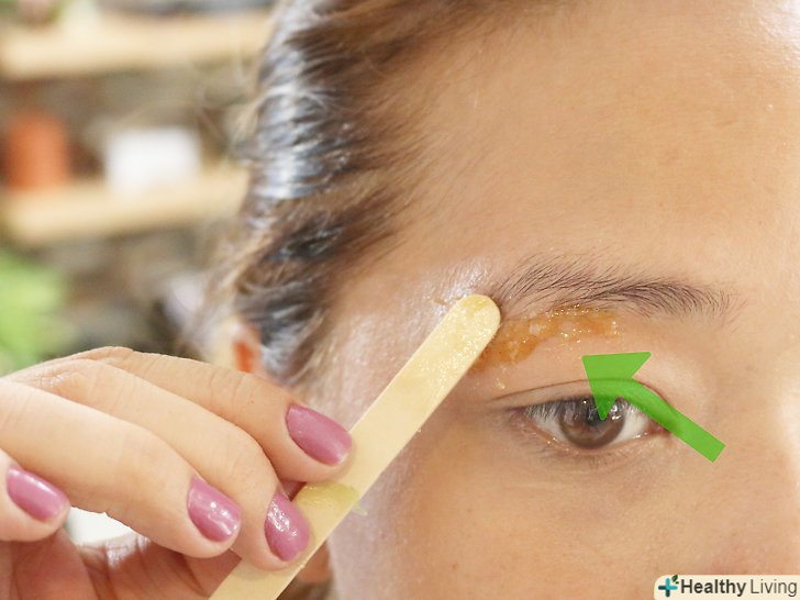 Нанесіть розтоплений віск на небажані волоски близько першої брови. з метою безпеки працюйте тільки з однією бровою за раз, щоб у вас була можливість сконцентруватися на тому, що ви робите. Якщо вам страшно все робити самостійно, попросіть кого-небудь вам допомогти. За допомогою аплікатора нанесіть віск на потрібні ділянки у напрямку росту волосся. Переконайтеся в тому, що віск покрив всю необхідну зону депіляції. Однак, шар воску необов'язково робити дуже товстим. [11]