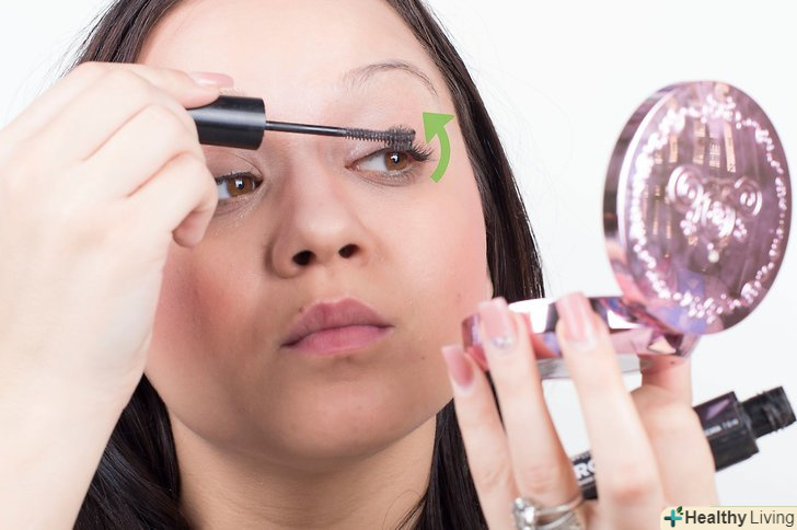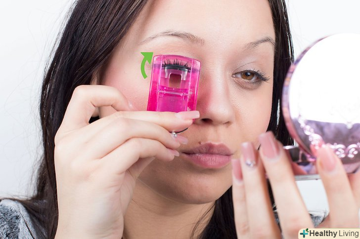 Зробіть завивку вій. перед нанесенням туші використовуйте інструмент для завивки вій, щоб надати їм ідеальний вигин. На додаток до завивки основи вій, також слід підкрутити і кінчики.- Подивіться вниз і розташуйте інструмент для завивки біля основи вій. Стисніть інструмент і утримуйте його в такому положенні 8 секунд.