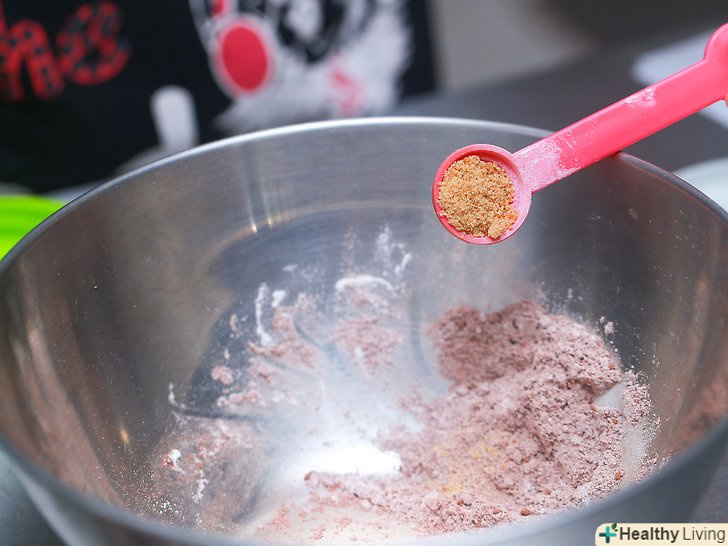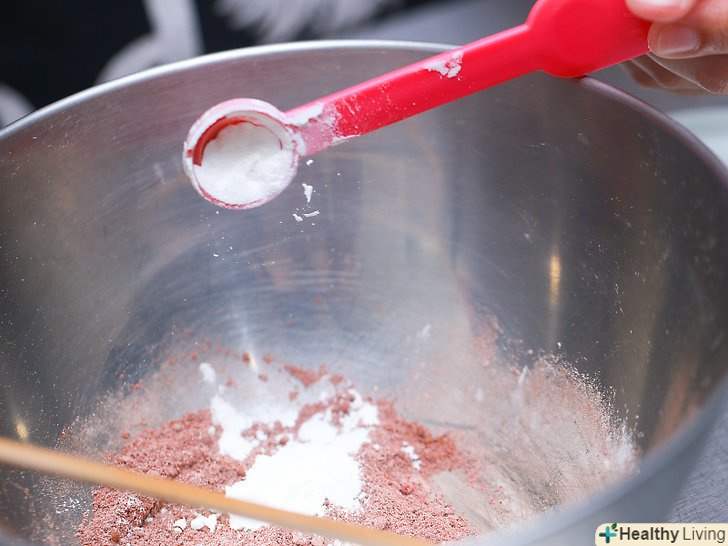 Додайте крохмалю з маранти (аррорута) і перемішайте. знадобиться ½ чайної ложки крохмалю з маранти. Відміряйте потрібно кількість і висипте в ємність. Перемішайте всі інгредієнти виделкою. Також ви можете просіяти всі інгредієнти через сито в іншу миску. Сито допоможе не тільки добре все перемішати, але і прибере залишилися грудочки. [5]- Якщо у вас немає крохмалю з маранти, можна замінити його кукурудзяним крохмалем. [6]