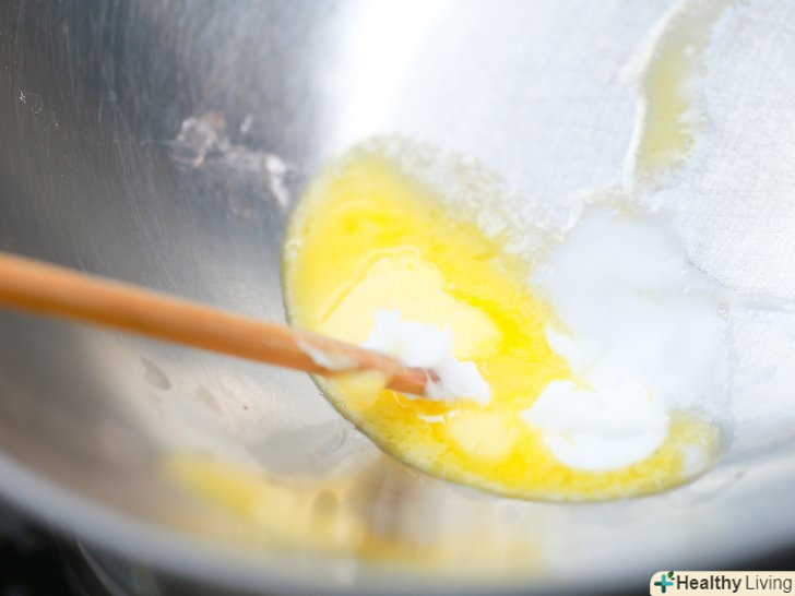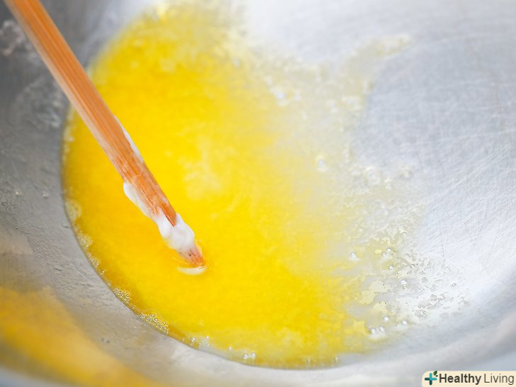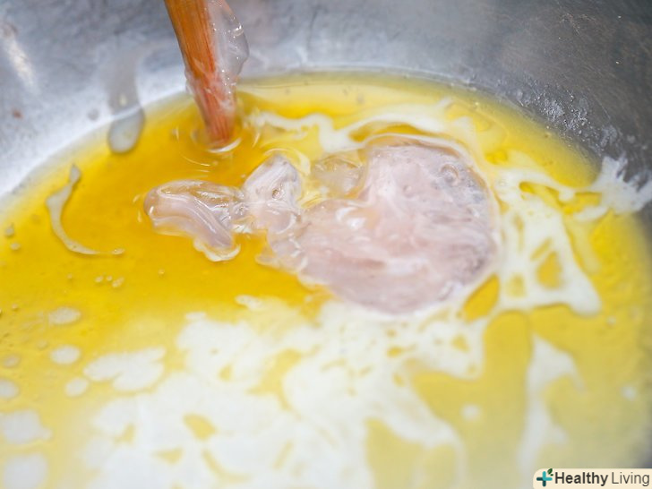 Зніміть пароварку з плити. як тільки масло ши і емульсійний віск повністю розплавляться, вимкніть плиту і поставте пароварку на жаростійку поверхню. Суміш в каструлі повинна виглядати напівпрозорою, і в ній не повинно бути грудок.