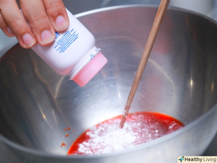 Додайте трохи присипки і перемішайте. повинна вийти щільна паста. Спробуйте додавати за один раз 1-2 чайні ложки присипки. Якщо у вас немає дитячої присипки, то ви можете зробити її самостійно, змішавши кукурудзяний крохмаль і крохмаль з коренів маранта. Рум'яна буду вологими і більш темного відтінку, але коли висохнуть, стануть трохи світліше.