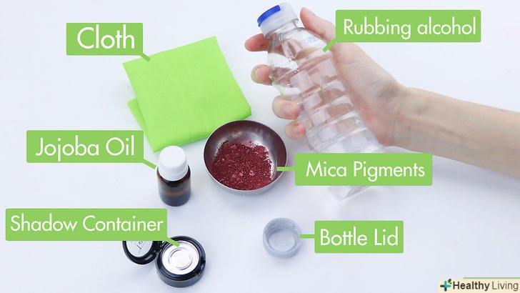 Зберіть інгредієнти. Тіні для повік виготовляються з пігментованого мінералу - слюди, змішаної з невеликою кількістю масла і спирту, щоб зволожити і зберегти їх. Ви можете зробити пудру або тверді тіні для повік. Купуйте наступні матеріали:- Пігменти слюди, доступні на інтернет-ресурсах, таких як tkbtrading.com.купуйте кілька кольорів, якщо ви хочете змішати їх, щоб зробити індивідуальний пігмент, або виберіть один, щоб зробити тіні для повік вашого улюбленого кольору.