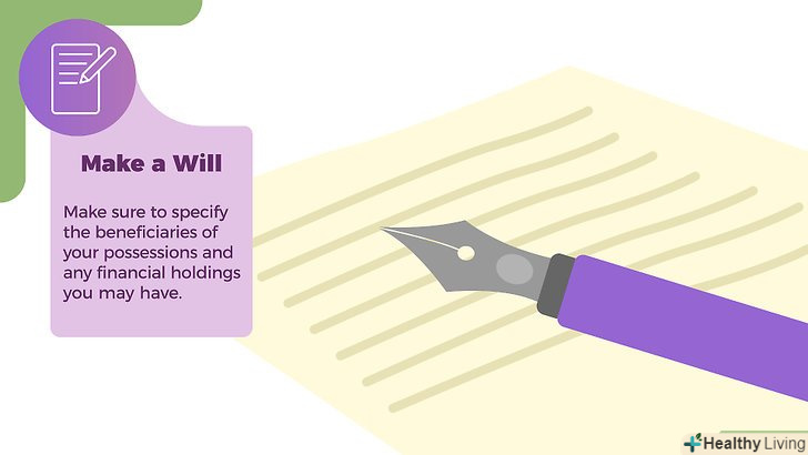 Складіть заповіт. заповіт може бути простим і коротким, однак цей документ дуже важливий. Якщо у вас ще немає заповіту, складіть його. Ви можете зробити це самостійно або за допомогою юриста. Вкажіть одержувачів вашого майна і грошових коштів. Якщо у вас є діти, вкажіть, хто стане опікуном. [12]- Вкажіть виконавця. Ця людина буде контролювати виконання вашого заповіту.