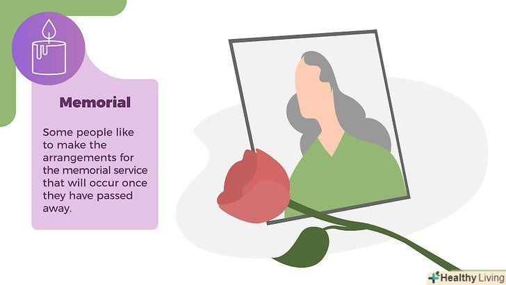 Подумайте проПохоронах . планування допоможе вам впоратися зі стресом. Деяким людям подобається продумувати власні похорони. Можна продумати план, який буде настільки детальним, наскільки ви захочете. [13]- Якщо ви хочете, щоб прощання з вами було тільки релігійним або тільки нерелігійним, вкажіть це в розпорядженні. Ви можете також вибрати музику.