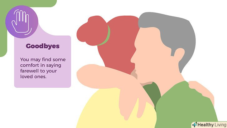 Попрощайтеся. можливо, Вам буде спокійніше, якщо ви заздалегідь попрощаєтеся з усіма близькими людьми. Вам напевно захочеться зробити це, і це дуже особистий процес. Пам'ятайте: в такій ситуації правил немає. Ви зможете померти з гідністю, якщо будете робити те, що самі вважаєте за потрібне. [14]- Можна поговорити з людьми. Якщо ви боїтеся, що Вам буде складно впоратися з емоціями, продумайте те, що ви хочете сказати, заздалегідь. Пам'ятайте, що емоції і сльози — це нормально.