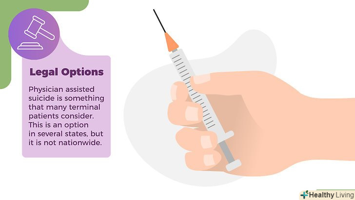 Дізнайтеся, на що Ви маєте право за законом. у деяких країнах у невиліковно хворих людей є можливість дати згоду на добровільну евтаназію, проте в Росії ця практика заборонена. Подумайте про те, щоб поїхати в ту країну, де евтаназія дозволена. [2]- Обговоріть цей варіант зі своїми родичами. Багато людей цікавляться евтаназією, оскільки вона дозволяє їм самим вирішувати, коли померти.