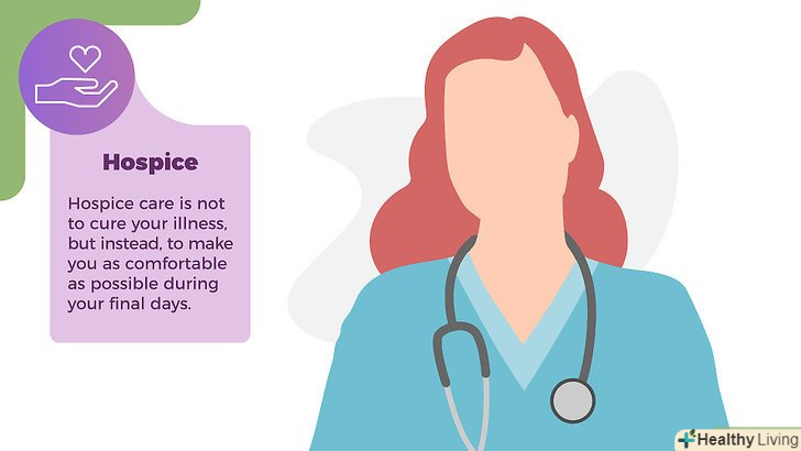 Подумайте про хоспіс. Якщо у вас смертельний діагноз, можливо, вам підійде хоспіс. Хоспіс-це місце, де людині допомагають прожити останні дні, а не лікують. Нерідко хоспіс забезпечує людині той догляд, який йому не можуть надати вдома. Для багатьох людей хоспіс стає комфортним місцем, де їм простіше змиритися зі смертю. Співробітники хоспісу готові допомагати цілодобово. [3]- Можна також найняти доглядальницю. Дізнайтеся, які варіанти є у Вашому місті. Вивчіть якомога більше самої різної інформації і вирішите, який варіант догляду Вам підходить.