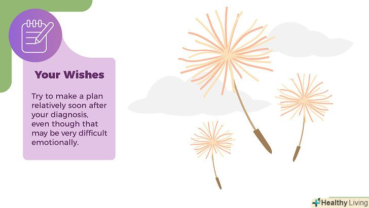 Знайте, що робити, якщо ви відчуваєте хвилювання. швидше за все, ви будете сильно переживати через смерть і того, що трапиться, коли вас не стане. Доведено, що найефективніший метод боротьби з переживаннями полягає в тому, щоб зосередитися на тому, на що ви можете вплинути. Коли початковий шок пройде, почніть думати про варіанти догляду за вами і продумувати план на майбутнє. [9]- Наприклад, ви можете почати шукати варіанти лікування та догляду. Розгляньте кілька варіантів і зупиніть свій вибір на тому, який здасться вам найбільш підходящим.
