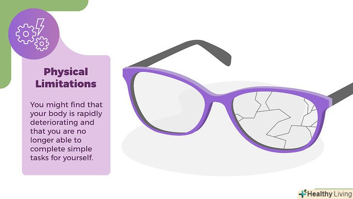 Навчіться справлятися з фізичними обмеженнями. нерідко в разі смертельного діагнозу здоров'я людини різко погіршується. Можливо, ви будете швидко втрачати здатність робити те, до чого ви звикли. Вам буде складно змиритися з тим, що тепер ви змушені будете вдаватися до допомоги інших людей. Багатьом людям важко зберігати при цьому почуття власної гідності. [5]- Поставтеся до вибору доглядальниці серйозно. Якщо вирішите найняти доглядальницю, під час співбесіди запитаєте, як людина звикла надавати допомогу. Вам потрібно буде знайти турботливу людину, яка не буде ставитися до вас поблажливо.