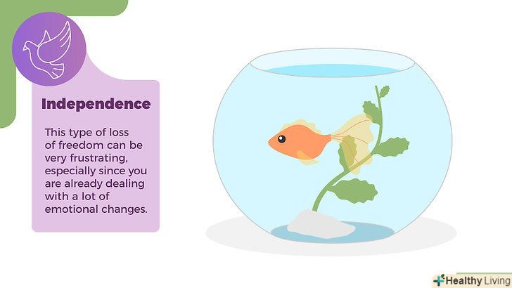 Будьте готові втратити частину своєї незалежності. можливо, ви втратите незалежність. Наприклад, через хворобу або препаратів ви не зможете водити машину. Це непросто, тому що ви і так вже змушені справлятися з новими емоціями. [6]- Ведіть щоденник подяк, щоб пам'ятати про те, що у Вашому житті є хорошого. Якщо кожен день ви будете записувати пару речей, за які ви вдячні, ви будете почувати себе краще. [7] наприклад, ви можете відчувати подяку за чашку гарячого чаю, за розмову з близькою людиною або за можливість помилуватися красивим заходом.