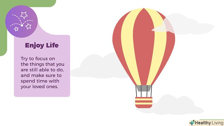Знайдіть спосіб отримувати задоволення від життя. можливо, вам залишилося жити кілька днів, тижнів, місяців або років. Складно думати про щось ще, якщо у вас смертельний діагноз. Однак важливо постаратися прожити залишок життя із задоволенням. Займайтеся тим, що ви ще можете робити, і проводите більше часу з близькими людьми. [10]- Якщо ви любите бувати на природі, намагайтеся щодня виходити на сонце. Попросіть друзів або родичів ходити з вами на прогулянки, коли вам захочеться.