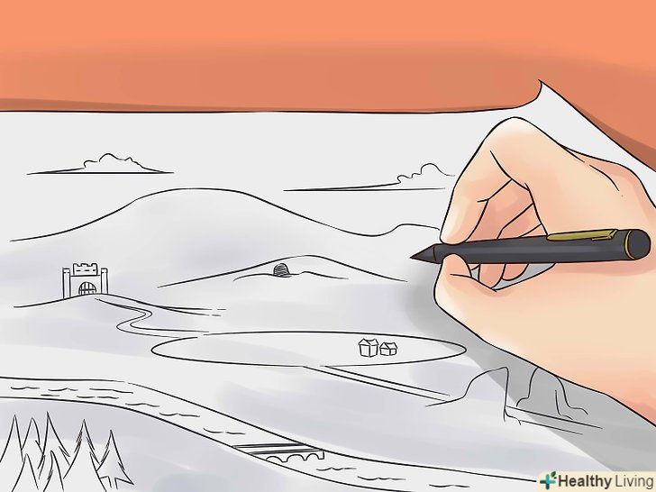 Намалюйте картуВсесвіту.щоб вам було простіше орієнтуватися у Всесвіті, намалюйте карту. Це може бути докладний малюнок із зазначенням різних типів землі і ландшафту і їх назв. Можна намалювати карту на комп'ютері. Спеціальна програма дозволить вам краще опрацювати елементи і їх співвідношення за розмірами.[5]- Постарайтеся зробити карту якомога більш докладною, оскільки ви будете будувати історію на підставі карти. Придумайте назви великим і маленьким містам, а також продумайте ландшафт, рослинність і клімат. Можна розмітити карту різними кольорами, щоб потім було простіше пов'язувати дії в історії.