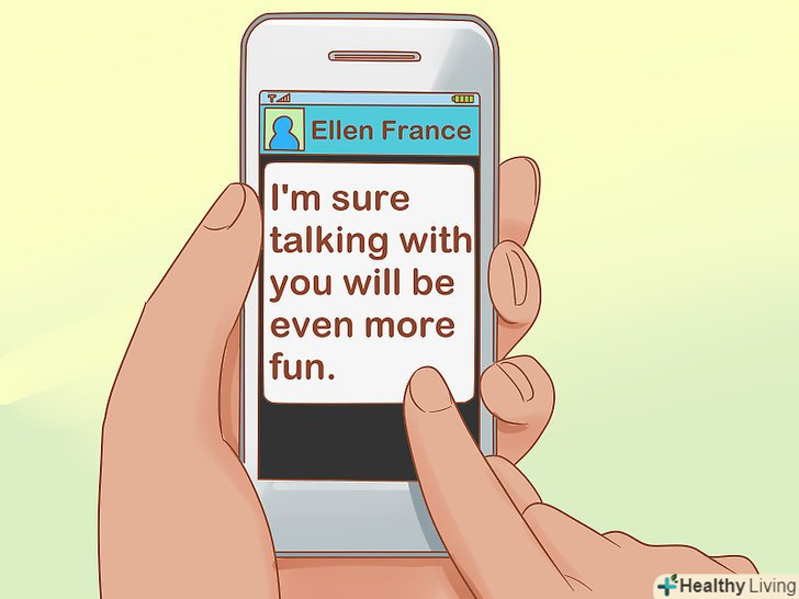Пишіть повідомлення Тільки для того, щоб встановити контакт з дівчиною. використовуйте текстові повідомлення Тільки для того, щоб сказати дівчині про те, що ви зацікавлені в продовженні спілкування з нею. Не допускайте, щоб текстові повідомлення стали для вас звичайним способом спілкування. Крім того, Спілкування за допомогою текстових повідомлень з малознайомою дівчиною може бути досить важким. У дівчини може скластися враження, що ви не зацікавлені в спілкуванні з нею. [2]
