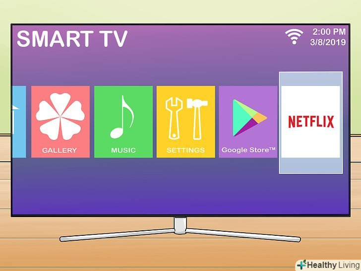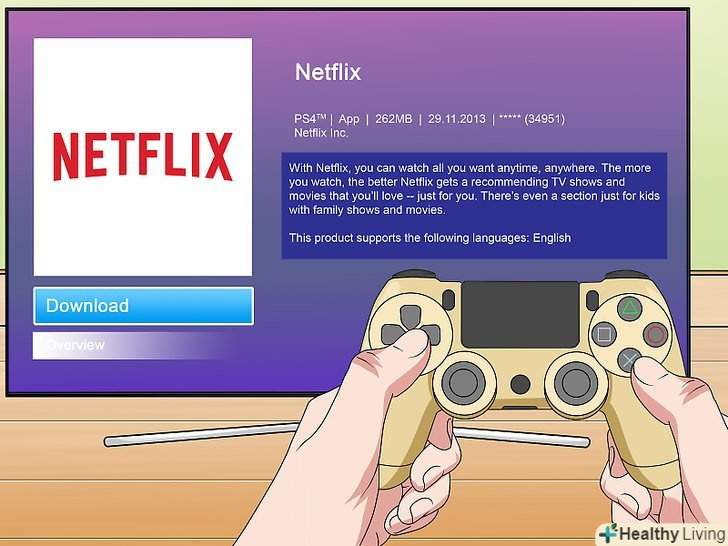 Встановіть програму Netflix.процес установки буде залежати від моделі ігрової приставки.- PlayStation 4 — / b> - додаток Netflix знаходиться в розділі "ТБ і відео" в головному меню. Якщо цього додатка в головному меню немає, встановіть його з PlayStation Store.[2]
