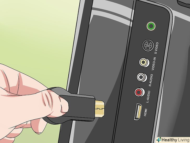 Підключіть HDMI-кабель до ноутбука і до телевізора.якщо на ноутбуці є HDMI-порт, вставте в нього один кінець HDMI-кабелю, а інший кінець підключіть до HDMI-порту на телевізорі. Запам'ятайте номер порту телевізора, до якого підключили кабель.- Якщо на ноутбуці HDMI-порту немає, пошукайте на ньому порт DisplayPort або Micro HDMI. У цьому випадку придбайте адаптер, щоб з'єднати один з цих портів з телевізором. Також ноутбук можна підключити до телевізора через Bluetooth, але в цьому випадку картинка і звук можуть не збігатися.