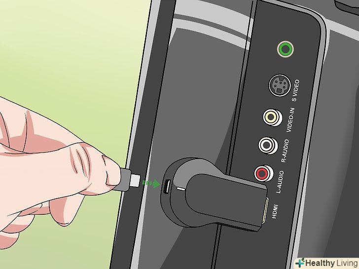 Вставте потокове пристрій Chromecast в HDMI-порт телевізора.це невеликий пристрій зі знімним кабелем, який підключається до HDMI-порту телевізора. Як правило, HDMI-порти телевізора пронумеровані, тому запам'ятайте номер порту, до якого підключений Chromecast.- Якщо кабель короткий, скористайтеся доданим подовжувачем.