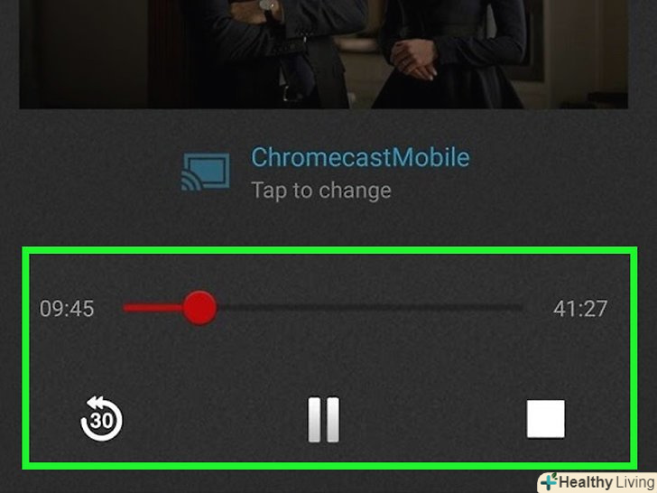 Керуйте відтворенням відео через додаток Netflix.наприклад, поставте відтворення на паузу. Щоб Відео відтворювалося на екрані телевізора, тримати відкритим додаток Netflix на смартфоні не потрібно – значки управління відтворенням відобразяться на панелі повідомлень. Налаштувати Chromecast потрібно тільки один раз; потім, щоб подивитися Netfli, включіть телевізор, налаштуйте його на сигнал з Chromecast, запустіть Netflix на смартфоні і підключіться до Chromecast.[1]- Щоб переглянути серіал, виберіть конкретний епізод. За допомогою пульта телевізора виберіть " Seasons "(сезони), а потім виберіть сезон. Тепер виберіть епізод і натисніть» Enter «або» Ok " на пульті телевізора.