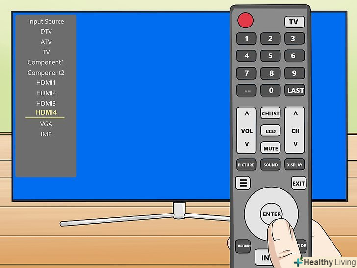 Увімкніть телевізор і налаштуйте його на сигнал з HDMI-порту, до якого підключений ноутбук.для цього натисніть кнопку "Input «(вхідний сигнал) або» Source" (Джерело) на пульті телевізора. На екрані телевізора з'явиться картинка з ноутбука.
