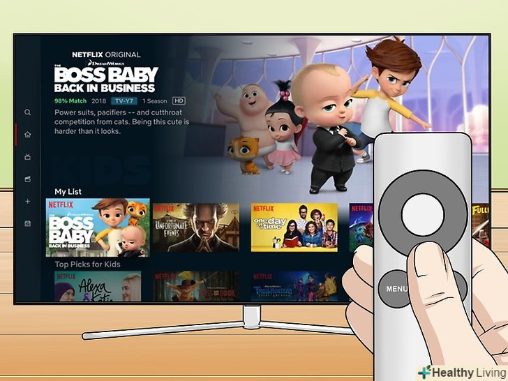 Знайдіть відеоролик за допомогою пульта.натискайте кнопки зі стрілками, щоб переміщатися по меню і контенту Netflix. Виділіть потрібне відео і натисніть " Select "(вибрати) або "Enter", щоб відтворити ролик.- Щоб переглянути серіал, виберіть конкретний епізод. За допомогою пульта виберіть " Seasons "(сезони), а потім виберіть сезон. Тепер виберіть епізод і натисніть» Enter «або» Ok " на пульті телевізора.