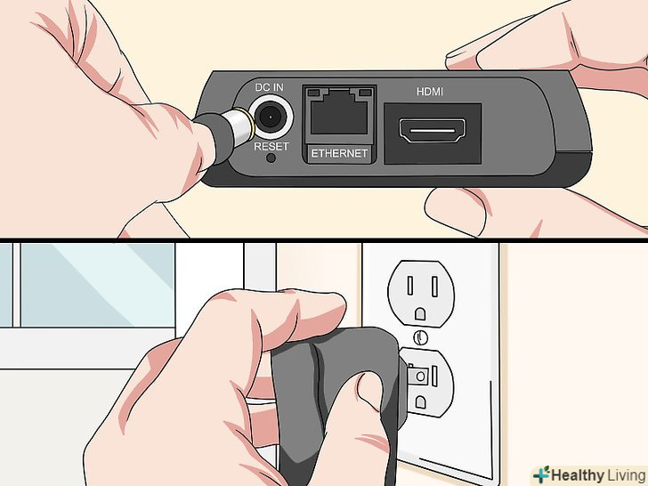 Підключіть Chromecast до джерела живлення.Chromecast поставляється з USB-кабелем, який можна вставити в адаптер живлення або в USB-порт телевізора. USB-порти деяких телевізорів недостатньо потужні, щоб живити Chromecast, тому краще скористатися адаптером живлення, який підключається до електророзетки.