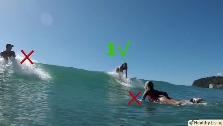Вивчіть базові правила поведінки, перш ніж почати займатися. [22] знання базових правил серфінгу дозволить вам переконатися в тому, що ваше перше заняття принесе вам задоволення і буде безпечним. Ось кілька базових норм безпеки, які вам необхідно запам'ятати:- Поважайте переважне право на рух. Якщо кілька серфінгістів намагаються зловити хвилю, людина, яка знаходиться ближче всіх до гребеня хвилі має переважне право на ту хвилю.