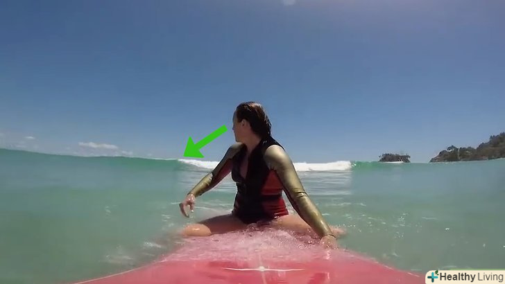 - Визначте цільову точку. Вам слід бути по пояс в світлій воді, де хвилі вже переломилися. Це найкраще місце для занять, якщо ви новачок. Чи не намагайтеся гребти занадто швидко і не запливайте якнайдалі туди, де займаються більш досвідчені серфінгісти, але при цьому переконайтеся, що ви досить глибоко, щоб не травмувати голову при падінні в воду.