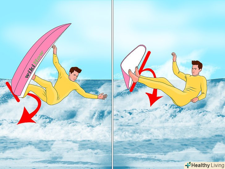 Будьте готові до невдач. якщо ви відчуваєте, що зараз впадете або вас накриє хвилею, стрибайте геть з дошки прямо в океан і чекайте слушного моменту. [30] хорошою ідеєю буде зістрибувати з борту дошки, при цьому прикриваючи голову руками. [31] Слідуйте за течією, дозволяючи хвилі нести вас. Пливіть обережно і стежте за тим, що у вас попереду, щоб не зіткнутися з дошкою.- Пробуйте дістати до дна, щоб не травмувати себе на мілководді або в рифах.