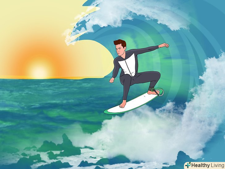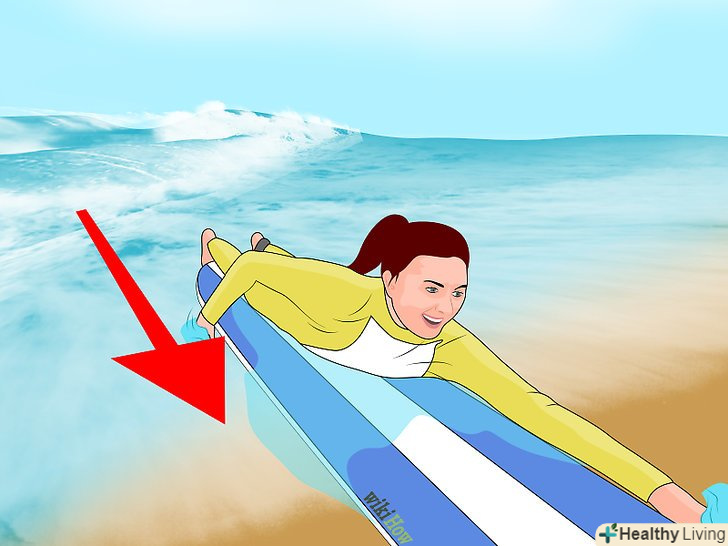- Набирайте швидкість. Вам потрібно зловити хвилю поки вона не пропала, і при цьому щоб у вас був час встати на дошку. Зазвичай новачки починають ловити хвилі біля берега (що весело для початку). [27]