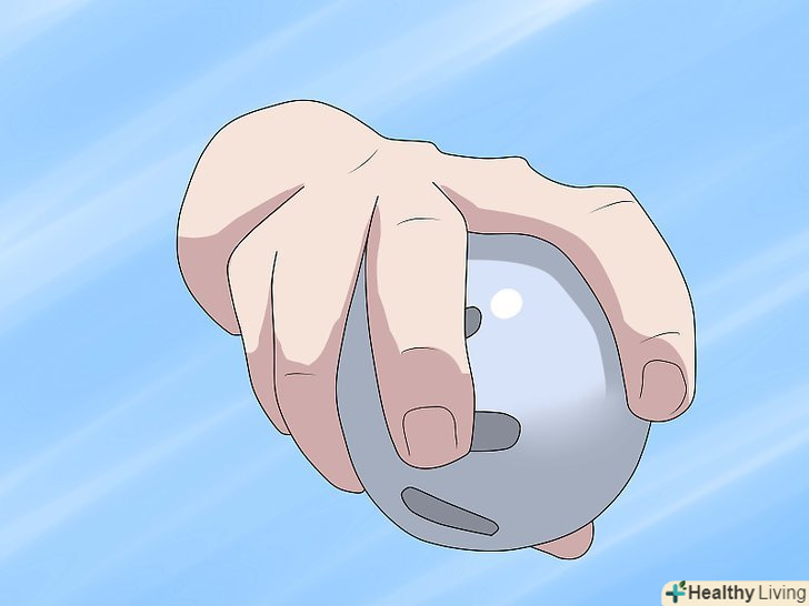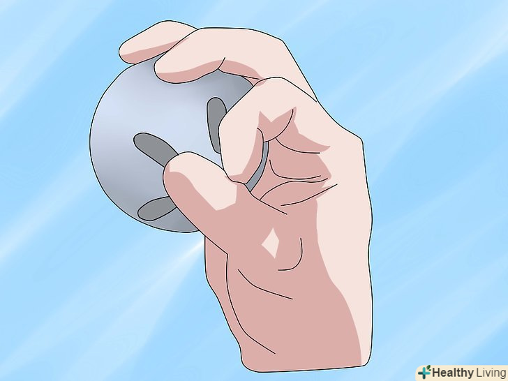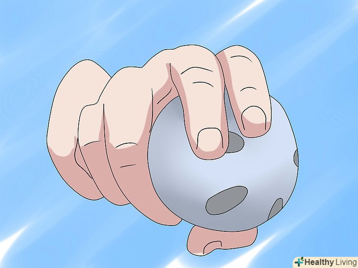 Накл. Тримайте м'яч, повернутий отворами до вас, Покладіть ваш вказівний і середній пальці на верхню частину м'яча, трохи закриваючи отвори. Замість того, щоб тримати його пальцями, тримайте суглобами вказівного і середнього пальців. Ваші інші пальці будуть постійно підігнуті, не торкаючись двох основних пальців. Також, не дозволяйте безіменному пальцю і мізинцю охопити м'яч, просто підігніть їх іншою рукою.- Підказка: удачі при цьому кидку (і ударі).