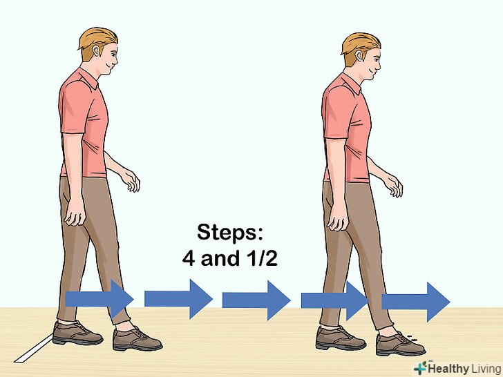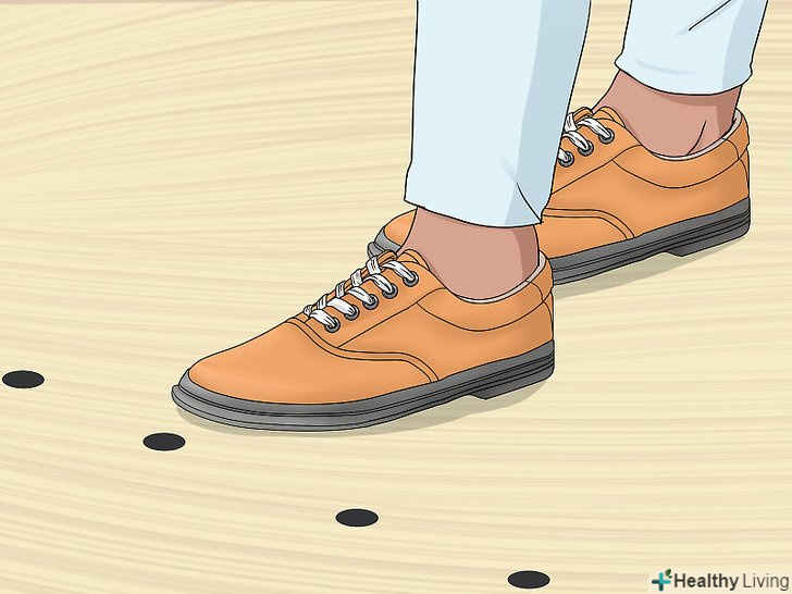 Виберіть початкову відстань до контрольної лінії. Встаньте п'ятами на контрольну лінію, розвернувшись спиною до кеглів. Зробіть чотири з половиною звичайних кроки і відзначте те місце, де розташовуються шкарпетки ваших кросівок. Зазвичай воно знаходиться між п'ятьма круглими відмітками і початком зони розбігу.- Якщо, зробивши чотири з половиною кроки, ви опинилися за межами кегельбана, вам доведеться починати кидок з п'ятами, злегка виступаючими за межі піднятої зони розбігу, і вкоротити перші кроки, підлаштовуючись під відстань, що залишається до контрольної лінії в міру наближення до неї. Тим самим ви уникнете заступу за контрольну лінію, проведену поперек кегельбана і з'єднує обмежувальні жолобки у їх початку.