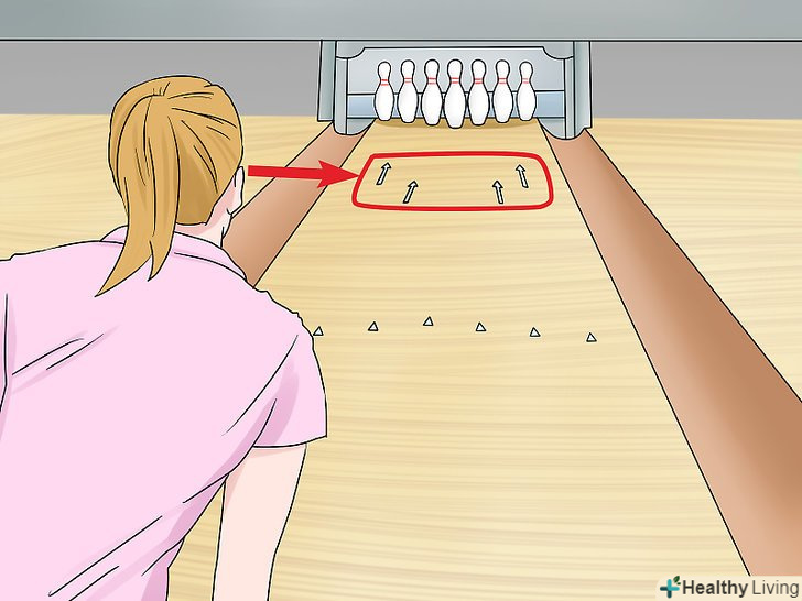 Цільтеся в другу стрілку від жолоба з боку вашої руки з кулею. приблизно в 4,5 метрах від контрольної лінії на доріжку нанесені стрілки, що допомагають цілитися.- Як правило, центр доріжки – це сама Масляна її частина. Тому, кидаючи кулю трохи вбік, Ви збільшите його зчеплення з доріжкою.