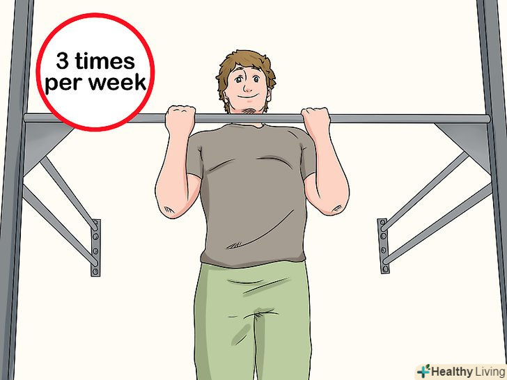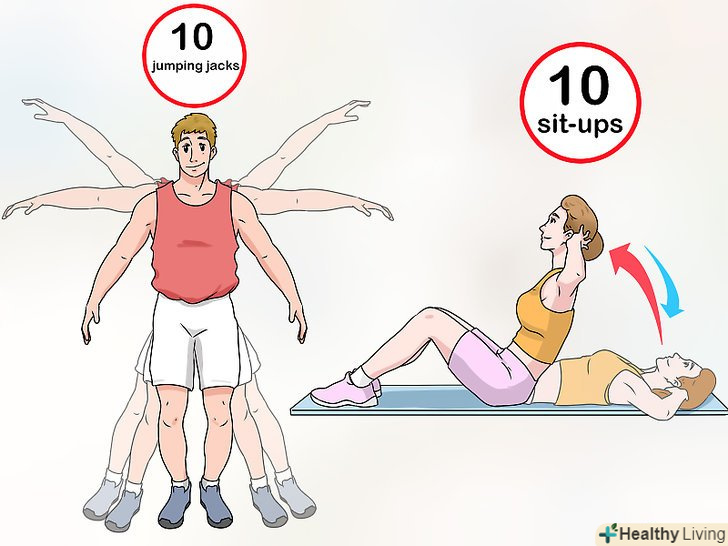 Почніть з коротких тренувань, з якими ви зможете впоратися. не намагайтеся займатися протягом години в перший раз. Краще поставити перед собою невеликі здійсненні цілі, наприклад, зробити 10 стрибків з витягуванням рук і 10 віджимань . [9]- На наступному тренуванні спробуйте збільшити кількість повторень до 15 і додати 10 присідань.