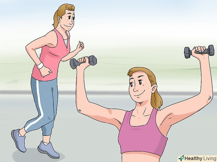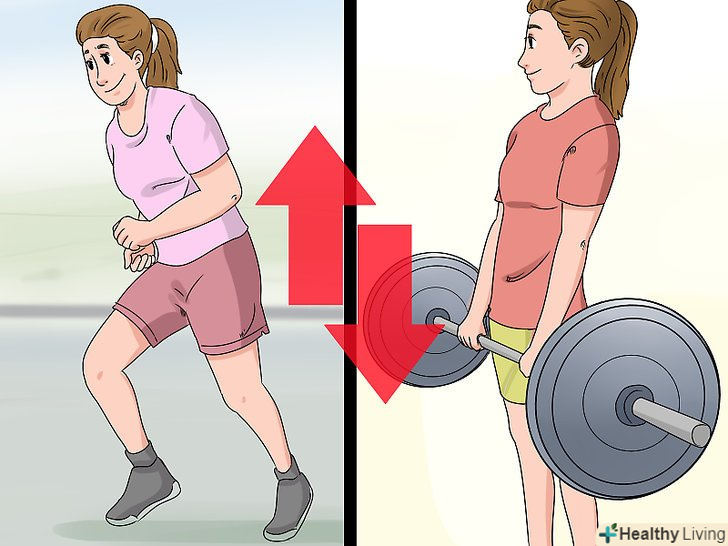 Включіть як кардіо -, так і силове навантаження в свою систему тренувань. якщо ви хочете прийти у форму, вам слід поєднувати вправи на розвиток витривалості (тобто кардіонавантаження) з силовими вправами (наприклад, з роботою з обтяженнями). [6]- Можна виконувати вправи, які поєдную в собі обидва типи навантаження. Додайте в свою кардіотреніровку стрибки з присідання, Берпі, а також біг в упорі на руки. Підійдуть і кругові тренування або Кроссфіт.