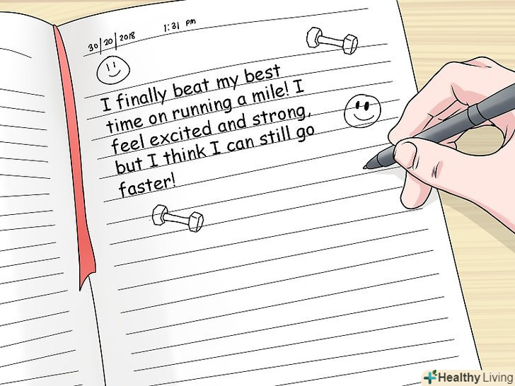 Ведіть щоденник тренувань і записуйте свої відчуття після кожного тренування. за допомогою щоденника можна також відстежувати свій прогрес. Якщо у вас немає бажання йти на тренування, перечитайте свої записи про приємні відчуття після тренувань і згадайте, як багато ви вже зробили. [14]- Можливо, в якийсь момент ви напишете, що ви нарешті змогли побити свій власний рекорд швидкості з бігу на 1 кілометр і що ви відчуваєте себе сильним і пишаєтеся собою, але при цьому вважаєте, що можете бігти ще швидше.