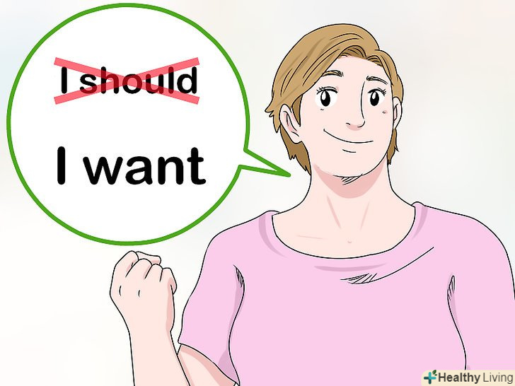 Замініть слово «повинен» словом «хочу». Якщо ви будете говорити собі, що ви повинні або що вам потрібно робити щось, вам буде складніше почати. Краще перечитайте свій список цілей і нагадайте собі, Чому ви хочете займатися спортом. [2]- Наприклад, якщо ви думаєте про те, що ви повинні піти на пробіжку, але не хочете цього, нагадайте собі про свою мету « " ЯХочу стати сильніше і впевненіше в собі, і сьогоднішня пробіжка наблизить мене до мети».