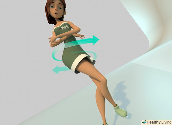 Тепер ваше тіло почне обертання, переконайтеся при цьому, що разом з тілом повертається і права нога, яка заходить ззаду навколо лівої ноги, таким чином, ви перебуваєте в зворотному обертанні в повітрі.