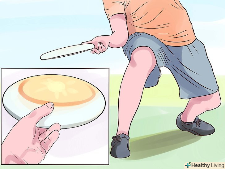 З часом ви навчитеся робити більш складні кидки, у вас буде краще виходити грати. ви можете пробувати тренуватися кидати диск, чим краще ви тренуєтеся, тим краще у вас буде виходити. Наприклад, рух "молоток" виконується так: вказівний і середній палець потрібно ставити під диск, а великий палець — на верхню частину. Чи не загинайте вказівний і середні пальці. Робіть такий рух, ніби кидаєте м'яч. Підніміть диск над головою, диск і ваша голова повинна утворювати кут. Переконайтеся, що кут становить приблизно 50-55 градусів. Дотримуючись того ж кута киньте диск вперед і вгору. Диск повинен летіти перпендикулярно землі протягом декількох секунд, потім перевернутися догори ногами і повільно полетіти в бік Землі. Такий кидок складно зловити, в основному він використовується для захисту.- Спробуйте потренуватися робити кидок в сторону. Поставте вказівний і середній палець під диск, зігніть їх. Покладіть великий палець на верх диска. Нагніть тіло трохи вперед, зігніть і розігніть зап'ясті, відпускаючи диск. Ви повинні трохи скрутити руки, направивши їх у бік тіла, коли кидаєте диск. Диск повинен досить сильно крутитися. Тренуйтеся, щоб правильно здійснювати цей кидок.