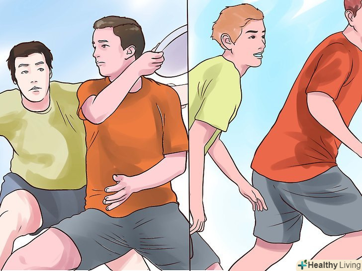 Коли ви захищаєте свою територію і свої ворота, необхідно блокувати і перекривати передачі гравцям протилежної команди. Вам необхідно вибрати одного з гравців і блокувати його під час гри, щоб йому було складно зробити передачу. Не відходьте від нього ні на крок. Грайте в захист, вам потрібно постаратися перехопити диск, щоб вам не забили гол. Ви можете піднімати руки, бігати навколо гравця і намагатися перехопити передачу.- Захист повинен грати досить активно і агресивно, не відходьте від гравця, якого блокуєте. Не підходьте до нього занадто близько і не штовхайтеся, фізичний контакт заборонений.