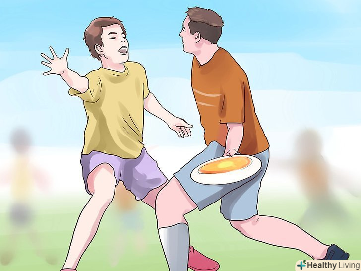 - Переконайтеся, що всі готові, потім підкиньте фрісбі високо в повітря в бік воріт іншої команди. Всі гравці повинні бігти в бік воріт іншої команди, щоб схопити диск, а гравці чужої команди — щоб захистити ворота.