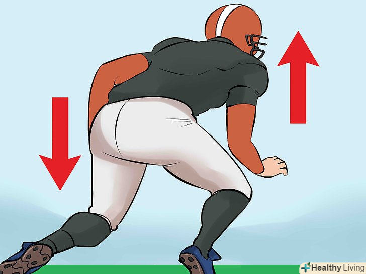 Перейдіть до відбору і швидкого руху ногами. зігніть ноги в колінах, опустіть стегна вниз і тримати руки ззаду. Підтримуйте рівномірний центр ваги, зберігаючи ноги на ширині плечей. Не стійте повністю на стопах, продовжуйте рухатися і дивитися за рухами нападника.- Завжди тримайте прямо голову і спину. Ця позиція є більш збалансованою і безпечною. Ні за яких обставин не слід опускати голову вниз, що вкрай небезпечно для вас і для гравця з м'ячем.
