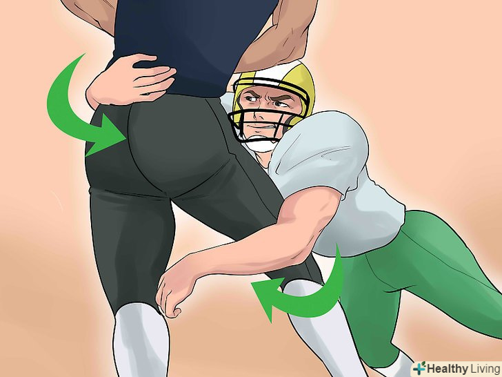 Вступайте в контакт. коли гравець з м'ячем в межах вашої досяжності, відштовхніться ногами так сильно, як зможете і використовуйте свої ноги, щоб проїхати повз вашого супротивника. Керуйте своїм провідним плечем в стегна гравця з м'ячем. Продовжуйте просуватися і рухайтеся ногами, поки гравець з м'ячем не опуститься. Під час руху підніміть високо коліна, наступні через блок.